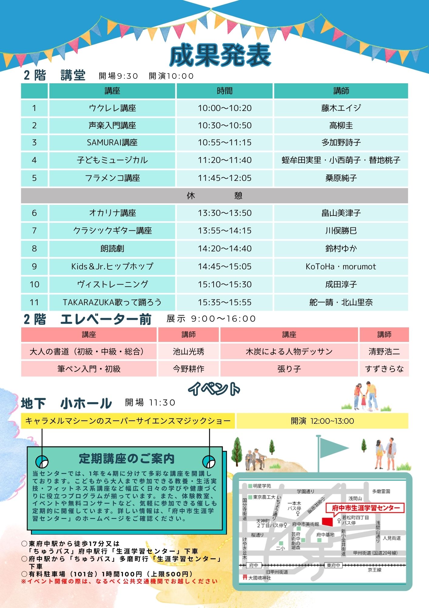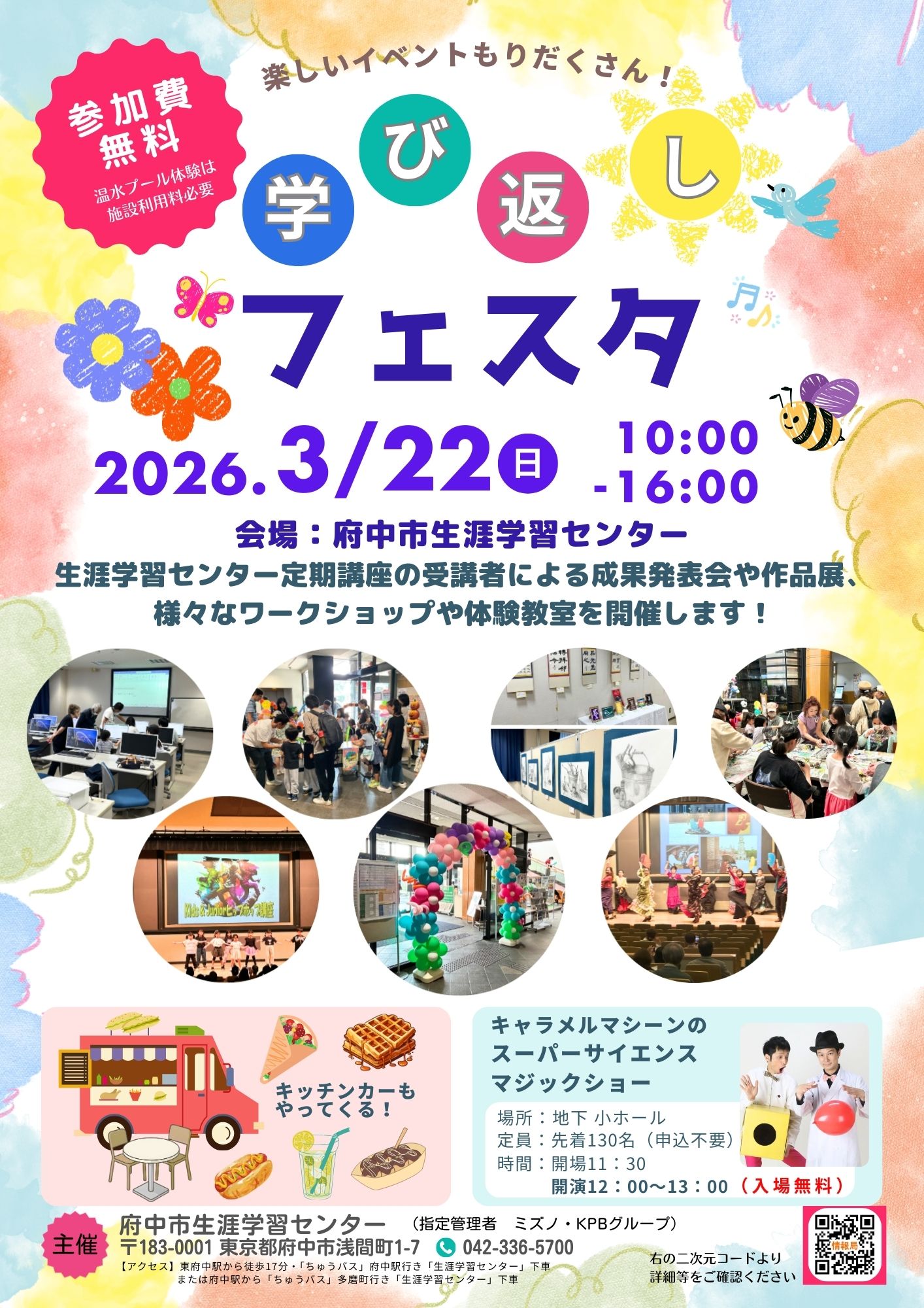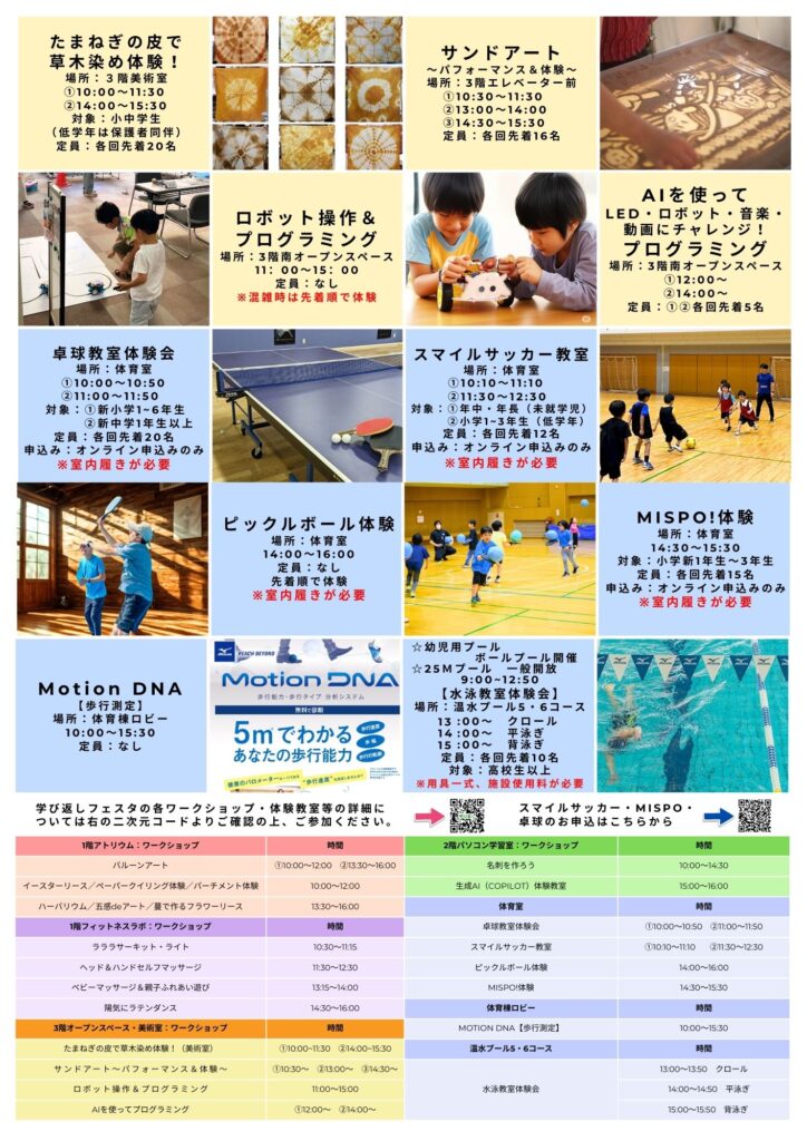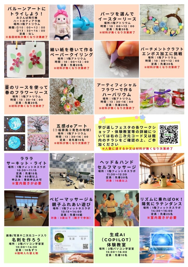 学び返しフェスタは3月22日(日)、お天気にも恵まれ、多くの来場者の皆さまにお越しいただき、盛況のうちに終了いたしました。成果発表にご出演いただいた皆さまをはじめ、ワークショップや体験教室にご協力くださった皆さまにも、心より御礼申し上げます。 来年度も、今年度をさらに上回る内容を目指して企画してまいります。その前に開催される10月の生涯学習フェスティバルも、どうぞ楽しみにお待ちください。