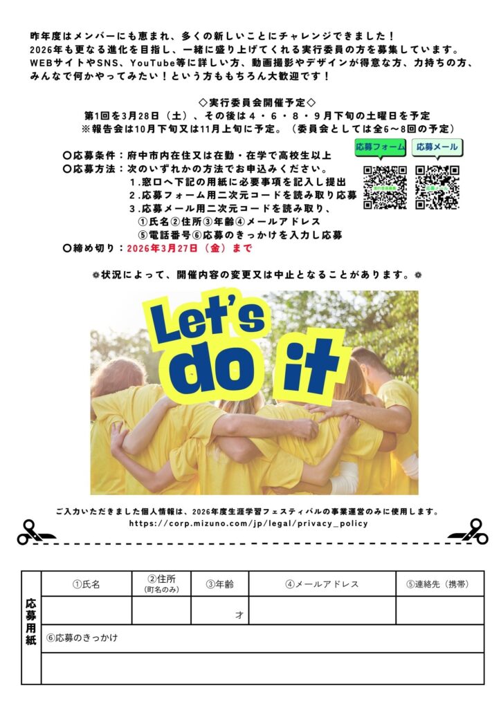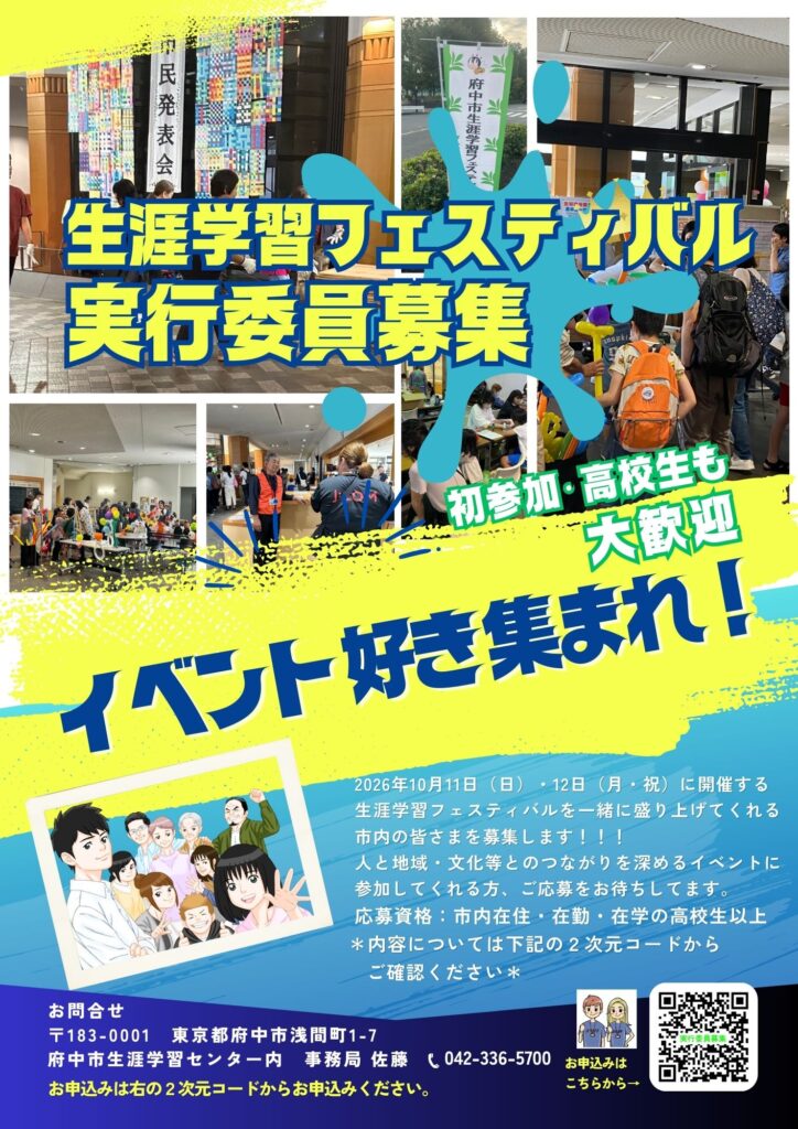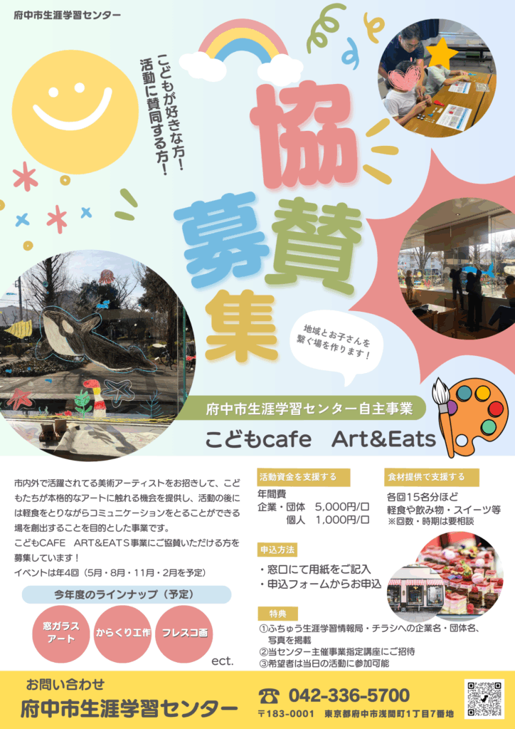 募集情報 2026年度府中市生涯学習フェスティバル実行委員募集 募集チラシ 応募要項 みんなで楽しみながら作り上げるフェスティバルを目指して、実行委員を募集します!「府中が大好き」「楽しいことが大好き」「みんなで盛り上げたい!」方など、大歓迎!!少しでも興味のある方はぜひご応募ください。みなさんで第33回生涯学習フェスティバルを一緒に盛り上げましょう!対象 高校生以上 市内在住又は在学・在勤の方詳細についてはニ次元コードにてご確認いただき、ご応募ください。お待ちしております!!!!! こどもCafe Art&Eats 協賛募集 こどもCafe Art&Eatsでは、芸術を学びながら、子どもたちが自分の作品について語り合ったり、先生の美術・芸術に関するお話を聞いたりする時間を大切にしています。その中でも、参加する子どもたちとのコミュニケーションを深めるひとときとして「おやつの時間」を設けています。この「おやつの時間」を支えてくださる、市内で営業されている事業者様や個人の方を募集しております。 お菓子や軽食のご提供、ご協賛など、形は問いません。子どもたちの創造の場づくりに、ぜひご協力いただけましたら嬉しいです。ご興味のある方は、お気軽にお問い合わせください。 皆さまの温かいご支援を、心よりお待ちしております。